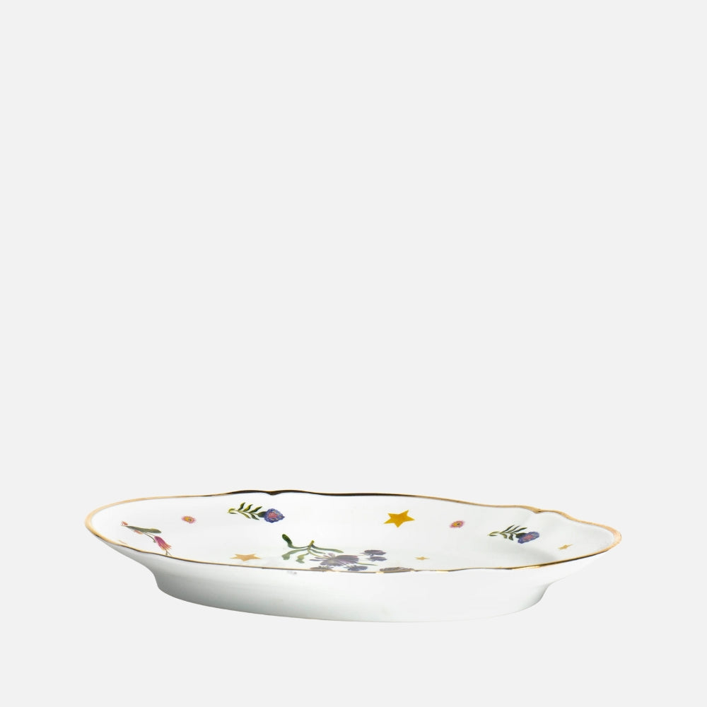 Bring a touch of character to the table with the Oval tray L 34 cm, crafted with Bitossi Home’s signature flair. Painterly purple florals and tiny yellow stars sit inside a gently scalloped rim with a gold edge.