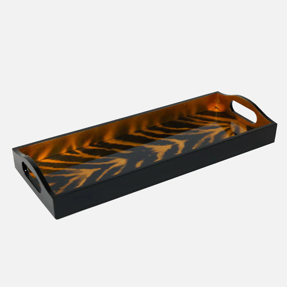 Unleash a bold touch of the exotic with the Wild Kingdom Lacquer Bar Tray. Featuring a striking animal-inspired pattern in rich amber and black tones, this tray makes a fierce statement whether displayed on a bar cart, coffee table, or vanity. The high-gloss lacquer finish adds a luxurious sheen, while the gold-toned interior edges provide a warm, reflective accent that elevates any space.