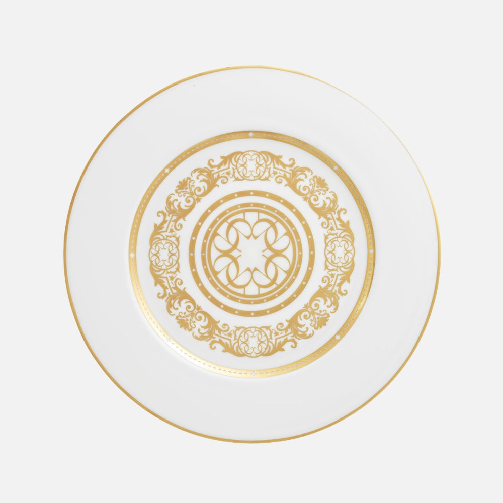 The Elie Saab Opera Gold Dinner Plate (27cm) brings timeless luxury to your table. Crafted from fine bone china, it features an elegant Baroque gold motif on a pristine white background—perfect for showcasing main courses with sophistication and style at any dining occasion.