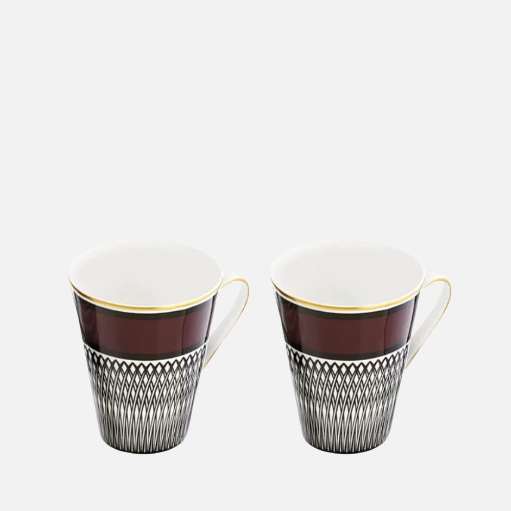 Expertly crafted from fine bone china, each 40cl mug showcases a bold burgundy background adorned with black curvy patterns and asymmetrical Art Nouveau-inspired lines. A delicate gold rim enhances their opulent finish, bringing a touch of luxury to every sip.