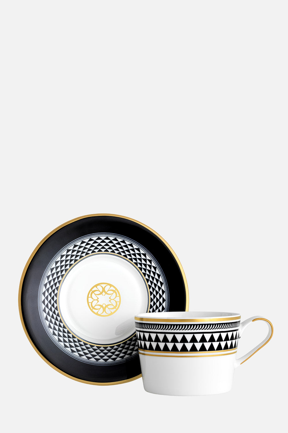 Enjoy tea in style with the Elie Saab Mosaique de Baalbek Teacup & Saucer Set (23cl). Crafted from fine bone china, it features a black-and-white mosaic pattern with a gold rim and monogram—blending Roman-inspired artistry with timeless elegance, perfect for gifting or refined tea moments.