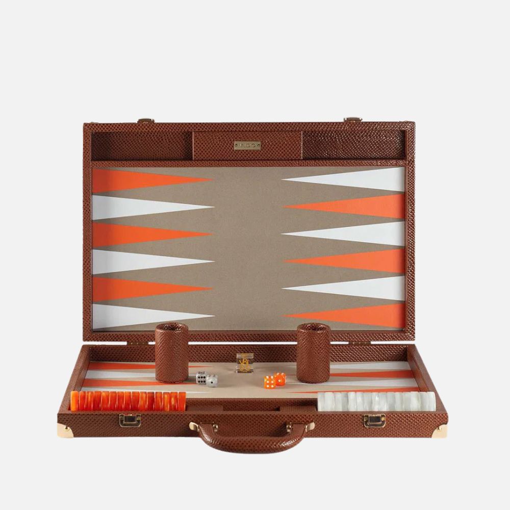 Our Brown backgammon set with Snake Skin pattern is carefully crafted with vegan leather, premium checkers and dice, and our signature VIDO doubling cube made of genuine crystal.